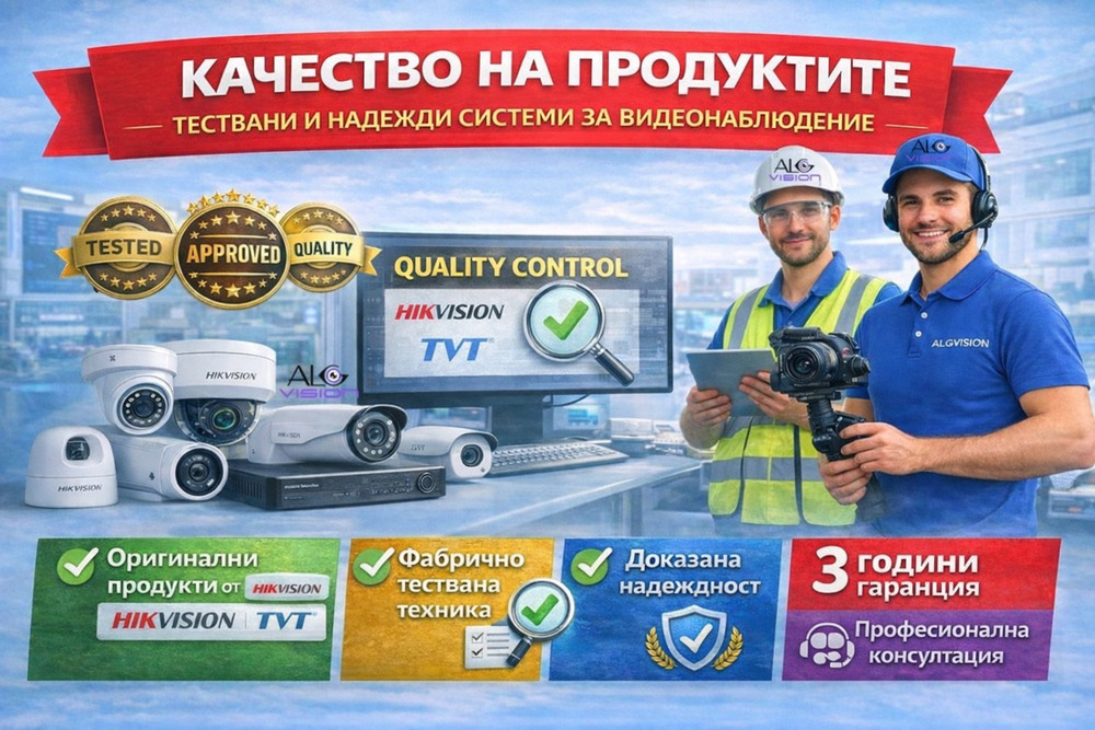 В ALGVISION вярваме, че качеството и надеждността са най-важните фактори при избора на система за видеонаблюдение. Затова всички камери, рекордери и аксесоари, които предлагаме от водещите производители Hikvision и TVT, преминават през строг контрол на качеството и тестове още във фабриката на производителя.